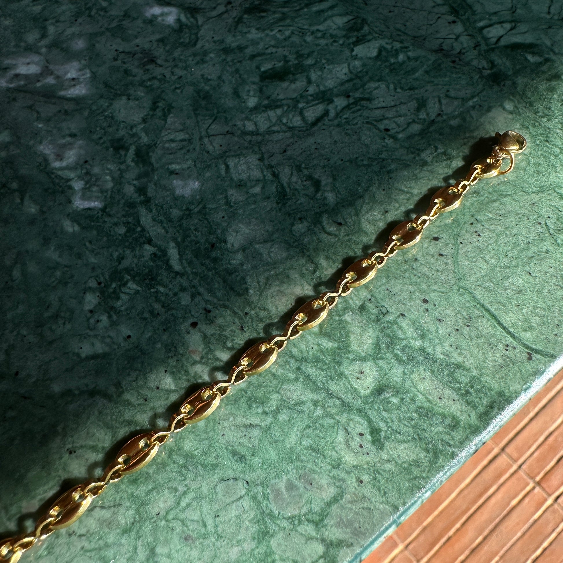 This statement chain takes its shape from the iconic coffee bean, reimagined in polished, sculptural links that wrap the wrist with quiet confidence. Sleek and grounded, it’s the kind of piece that holds presence—on its own or layered.