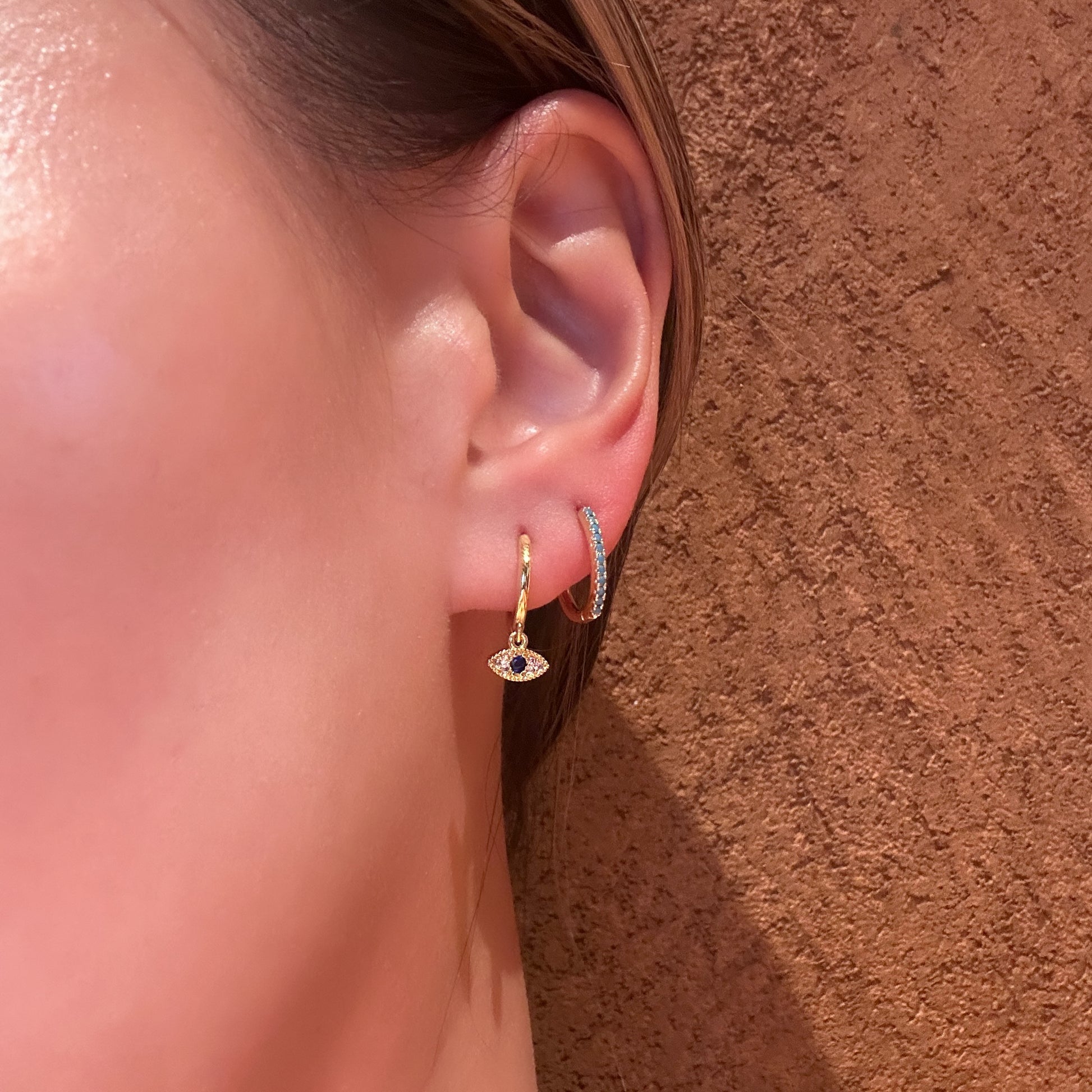 Delicate yet bold, these earrings feature the iconic evil eye—an ancient symbol of protection reimagined in sleek, minimal form. Designed to shield your energy while elevating your look.